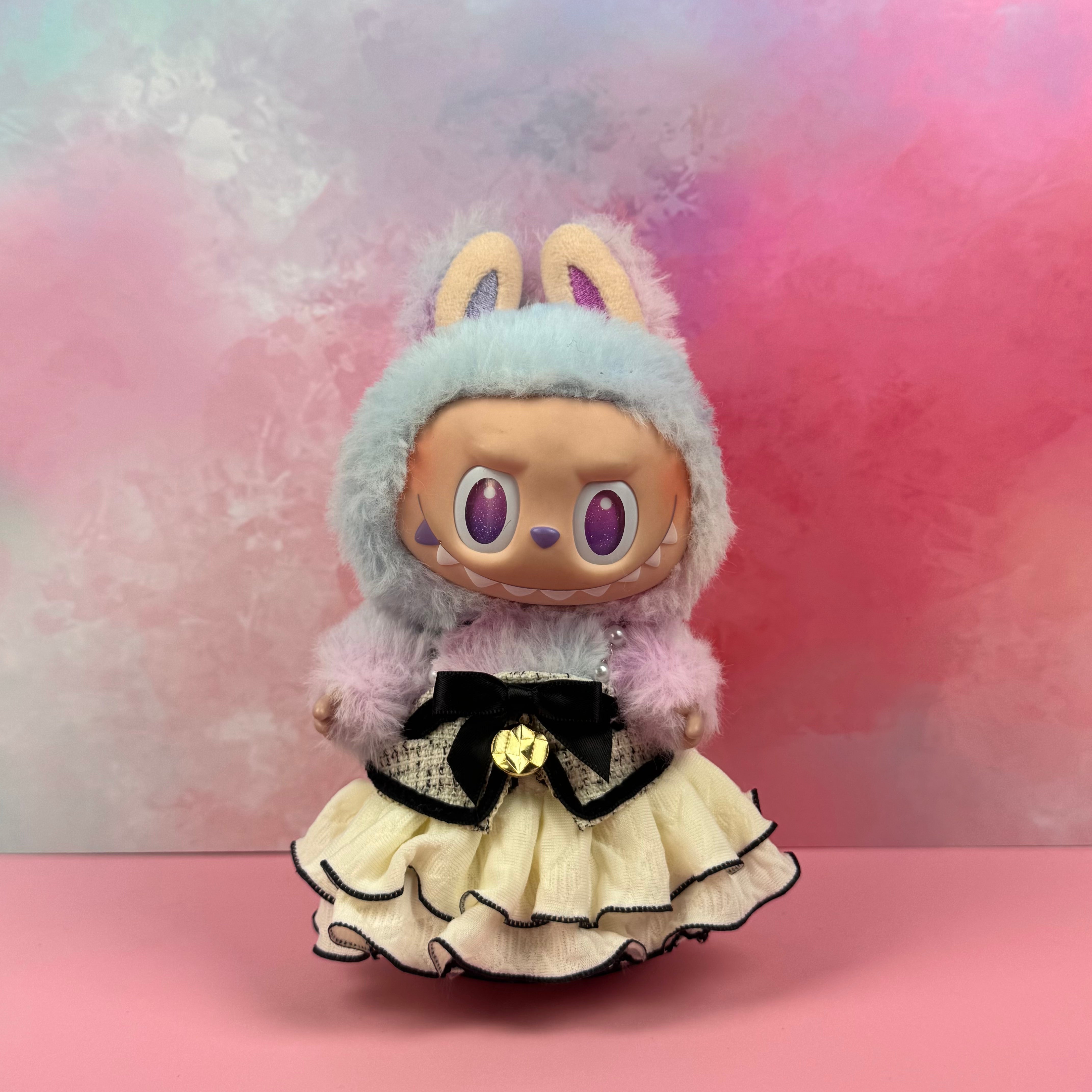 Elegant Belle – 20cm Labubu Outfit (Bunny Hood + Cream Ruffle Skirt)